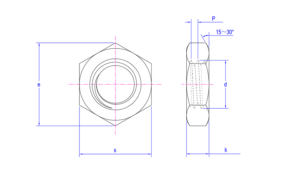 | Características de apariencia | Forma: Hexagonal con seis lados simétricos, lo que permite apretar y quitar fácilmente con una llave u otras herramientas. Este diseño proporciona una mayor comodidad operativa en espacios reducidos. Grosor: En comparación con las tuercas hexagonales estándar, es más delgada y se clasifica como tuerca delgada. Es relativamente liviano y ocupa menos espacio. Tratamiento de superficie: Normalmente conserva el color natural del acero inoxidable con un brillo metálico. También puede someterse a pasivación, pulido u otros tratamientos superficiales según sea necesario para mejorar la resistencia a la corrosión y la estética. |